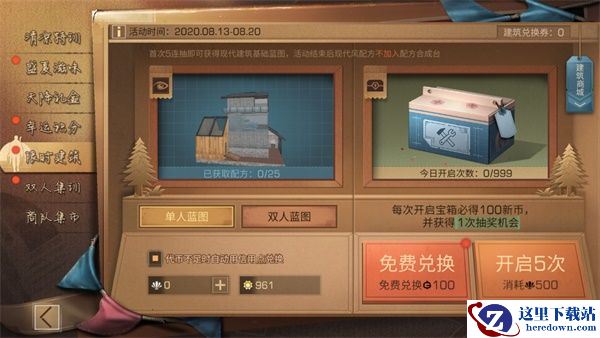 1、13号-20号在【集训-限时建筑】中,消耗500彩贝开启宝箱,可以抽取顶级和稀有建筑配方。