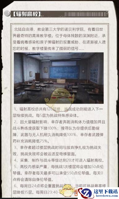 5、高校内感染严重,每挑战1次楼层将会增加50点伦琴值。幸存者每天最多可以承受550点伦琴值。每天0点将会清除自身伦琴值。