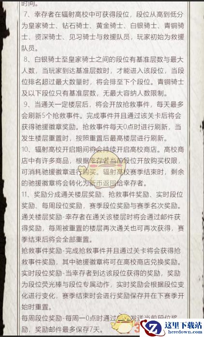 7、幸存者在辐射高校中可获得段位,段位从高到低分为皇家骑士、钻石骑士、黄金骑士、白银骑士、青铜骑士、资深骑士、见习骑士与救援队员,玩家初始为救援队员。