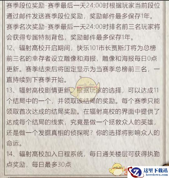 13、辐射高校剧情更新。根据玩家的选择,可以达成11个结局中的一个,并领取该结局的奖励。每个赛季只能领取首次达成的结局奖励。在辐射高校的界面中提供了达成每个结局的线索,究竟是做一个拯救众人的英雄,还是做一个发掘真相的侦探呢?你的选择将影响众人的命运。