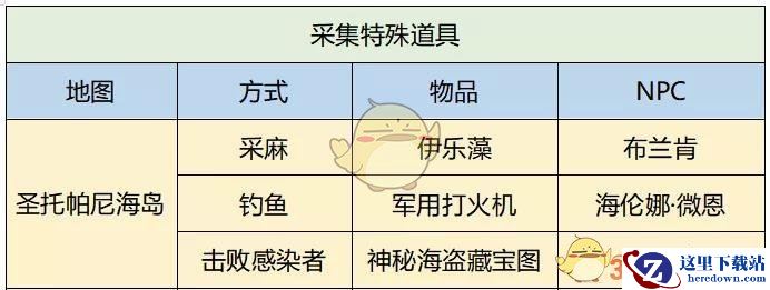 随着新地图圣托帕尼海岛出现,采集特殊道具,也多了三个,分别是伊乐藻、军用打火机和神秘海盗藏宝图。