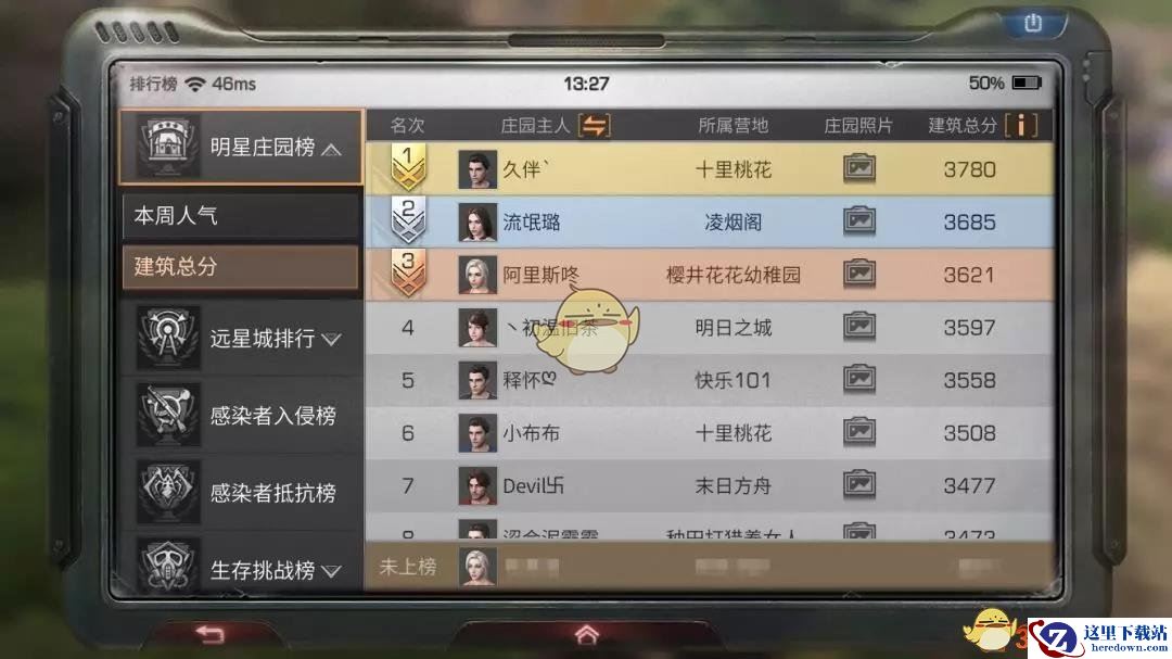 登上庄园排行榜,明星庄园榜排行,分为本周人气排行,和建筑总分排行,建筑总分高的庄园就能登上排行榜啦,这是荣誉的象征~
