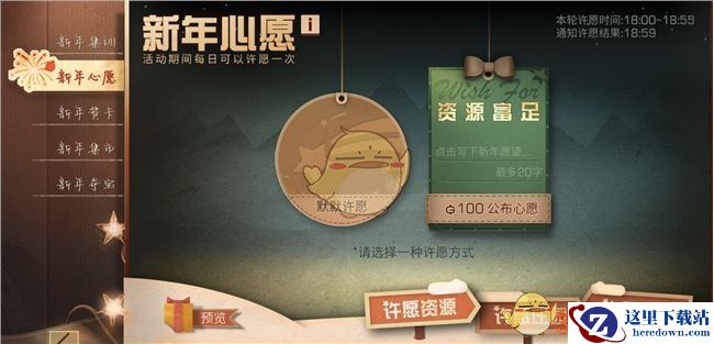 经过艰难的求生阶段,文明之光又重新在营地中燃起了。那么,在第一个新年庆典之间,幸存者们每天都可以进行一次许愿,若被选中愿望,则有机会将生存需要的资源、庄园需要的建筑强化材料和新币、技能点等生存物资带回家。运气够好的话,还能额外获得“ 2019 幸运儿“的金色称号礼物以及稀有资源。
