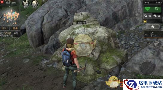 换上镐头,找到一块石头,十字对准石头开始敲,可以获得石头。