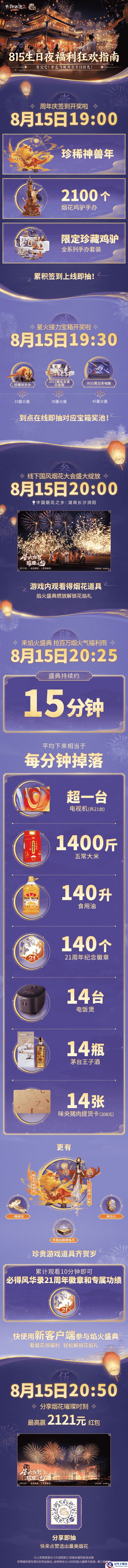 星火相聚,璀璨之约!《大话西游2》21周年庆线下国风烟花大会将于今日(8月15日)20点在烟花之乡·湖南浏阳开启,以烟花、打铁花非遗文化之美,演绎渔村启航、长安盛景、三界悠悠、五族集结、星火相聚五大篇章。其中,更有渔村主题烟花、三界场景概念烟花、五族技能概念烟花、长安桥烟花等创意烟花表演,还将有500架无人机齐聚夜空,为大话21周年生日庆生!