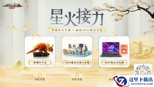 完成烟花大会活动预约、邀请好友助力均可领取星火值,累积达10/30/45即可升级星火宝箱,更可解锁2023鎏金宝鉴白金版、ROG魔霸7Plus笔记本电脑抽奖!累积达45星火值必定解锁21元现金红包!(2100个现金红包,先到先得)