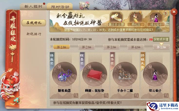 新服活动期间,人物大于30级,满足指定成长值并在抽奖当天19:30保持在线即可抽奖,奖励分保底奖、惊喜奖、豪华奖和终极大奖四大类,不仅有几率获得绛云仙子(绝版人形神兽)、颜如玉(五常神兽)、一级藕丝步云履、鎏金宝鉴召唤兽等珍稀奖励,还有几率获得手办十二藏、祭剑魂主角手办、《十八周年鎏金画卷》精装版、《大话一生》皮影、《群侠列传》画册、#157大包子表情公仔、大话2桌面屏风、少年游鼠标垫等豪华实物奖励。