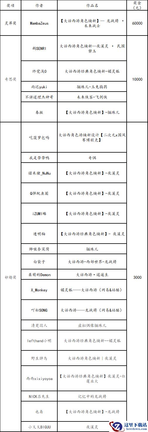大话经典角色焕新大赛,针对逍遥生、飞剑侠、龙战将、媚灵狐、夜溪灵、骊珠儿6位经典角色,向大家征集形象焕新设计。作品征集阶段,各路大神纷纷出手,涌现出了一大批精致而富有内涵的作品。参赛作品经过专业评委团的评审,决出了灵犀奖1名、奇思奖5名、妙趣奖20名,具体获奖名单如下: