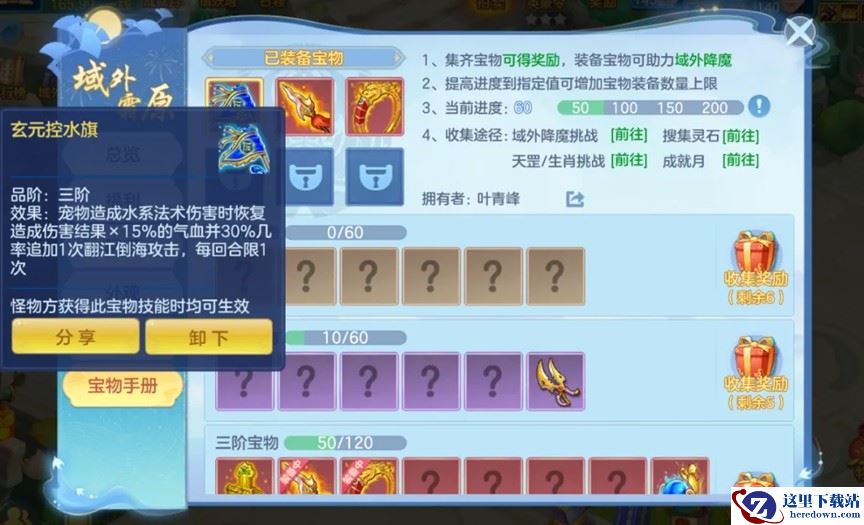 每小时10分、20分、40分和50分,野外会出现域外灵石,拾取灵石并送给灵石收集者可获取奖励和宝物碎片,集齐宝物可领取道具奖励并装备进战,助力“域外降魔”挑战!