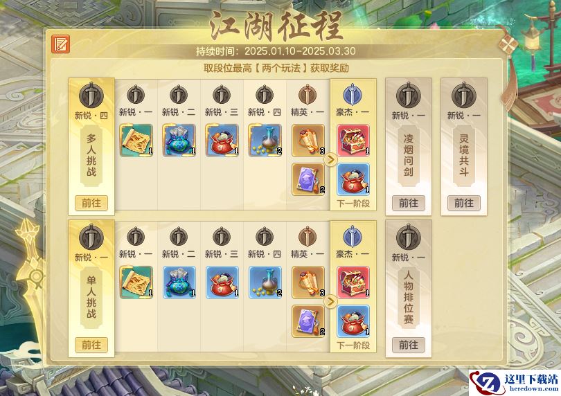 在《幻唐志》赛季服中玩法多样,所有玩法都可随心参与。无论是喜欢激烈的竞技对战,还是热衷于攻略副本的少侠,都无需担心奖励获取,江湖征程活动会以少侠最高两个段位来发放奖励!