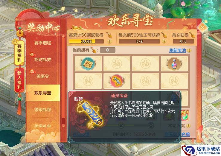 除此之外,少侠还能参与欢乐寻宝活动,通过挖宝有概率获得双人坐骑与神兽。累计一定次数还可领取唤灵卷轴、山水玄机图、高级兽诀等奖励。