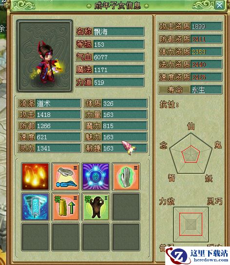 养孩子很麻烦,首先要洗属性点,那到底多少起始属性点才算好,其实大家只要知道,孩子成年属性石按100点算的,超过部分不计入总数,也就是说,你孩子起始属性哪怕是100点,最后成年后,不波动的话,和总数85的孩子是一摸一样的,所以没必要最求高起始属性的孩子。再有,比如说法孩子,起始属性只有80,但武艺属性是0,这你就要看了,很可能比总属性90的孩子还要好,因为法孩子不需要武艺,而90属性的孩子武艺属性很可能有10多点。 然后就是做孩子图,每个流派的最终属性都不一样,比如法孩子有道,巫,儒,选择哪个主要看图的结果,哪个流派养成后属性点最高选哪个。 接着是吃书,这个就不用多说了,值得一提的是吃东西一定要按图的顺序来,否则点数会乱。 最后就是波动了,胆小的觉得波动不可靠,往往选择正常成年,不过游戏玩的就是激情,不波动太对不起这游戏了。本人对于法孩子波动的一点心得,其实和流派有关,我养过好几个法孩子,最后波动是根据流派的,巫偏向于体质,儒偏向于速度,道法偏向于灵,所以建议法孩子最好选择道法入门,下面是孩子的成年图。