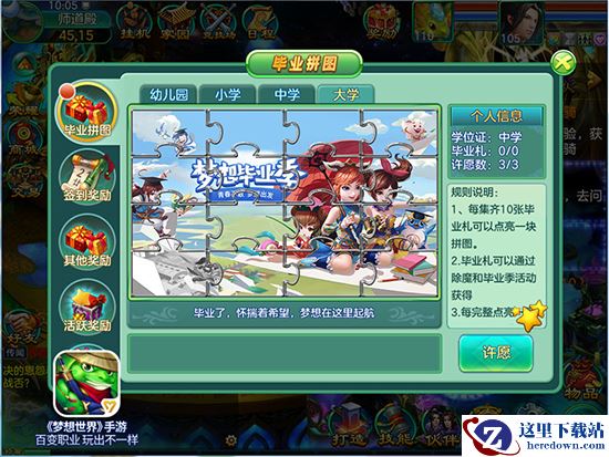 上次小编给大家爆料了第一个活动,今天小编给大家全面介绍一下剩下的活动!本次毕业季活动共开放“科举考试”、“逃课大追捕”和“指导教育”三个玩法,通过三个玩法收集“毕业拼图”所需的毕业札;完成拼图即可获得许愿机会,中国娃娃、百万银币、高级兽决等你拿。