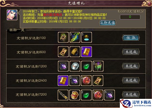 2019年到了,参加庆新年活动,赢得丰厚奖励!活动期间,在Ecard充值平台充值大话3专用点,达到一定额度即可在游戏中领取丰厚的奖励。