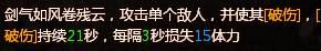 《龙》中伤害分为两种,一种是暗伤类的伤害,一种是攻击伤害。一般来说技能中明确写明数值,造成多少伤害的,都是暗伤类伤害。例如风火雷雨,以及各种持续掉血的减益效果如剑的技能中风云产生的特效【破伤】: