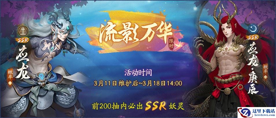 本周还将开启新一批“妖灵染色”服务,主打“应龙-逆鳞之煞”与“应龙·庚辰”,降妖师们可开启色盘,消耗道具“草木染锦囊”获得随机色彩,并有机会获得闪耀颜色。更新维护后至3月18日14时期间,SSR妖灵“应龙”与“应龙·庚辰”将加入“流影万华”活动卡池,方便降妖师们打造自己的炫彩龙君。
