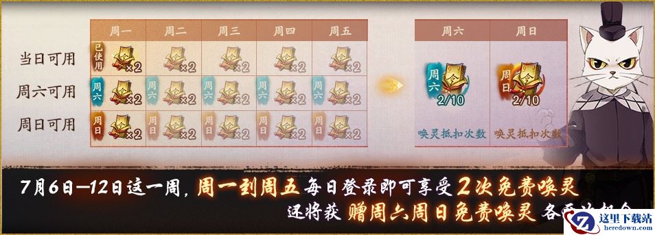 7月6日至12日,免费唤灵福利《大理寺日志》联动特别版将上线,降妖师们每周一至周五上线即可为当日及当周周末获得最多累计30次免费唤灵抵扣。