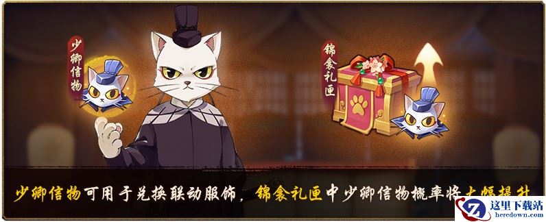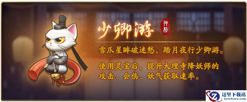 获取联动主角服饰“少卿大人”后,降妖师将可以在切换为大理寺职业后,以白猫少卿李饼的形象出战,用手中的剑,尽展大理寺的威严!联动灵宝“少卿游”则可提升大理寺降妖师的攻击、会伤和妖气获取速率,与少卿大人搭配使用效果极佳!