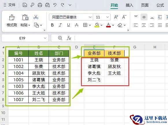 如下图所示,我们想根据所属部门,查找对应的员工姓名,然后姓名按行排列。