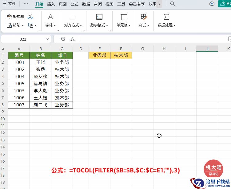 公式中先使用FILTER函数根据条件查询出数据(因为需要向有填充,所以$B:$B,$C:$C要绝对引用),然后再使用TOCOL函数把查询结果转换成一列显示,TOCOL函数第2参数是3,代表忽略空白单元格和错误值。