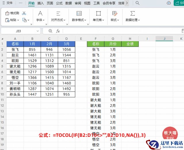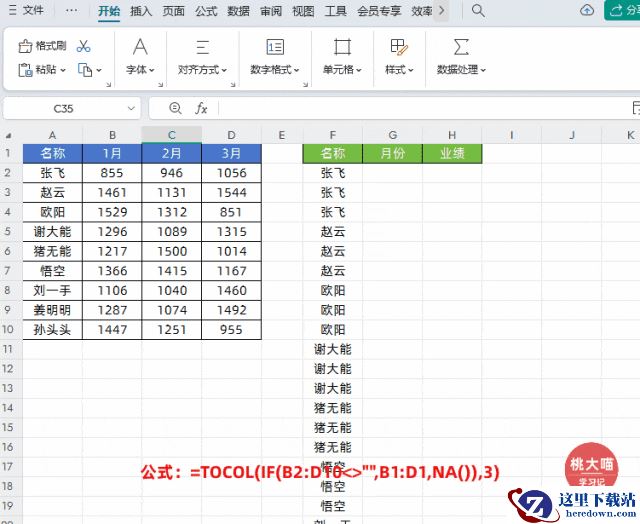 公式中首先使用IF判断函数,B2:D10每个月份销售额是否为空,如果不为空返回右侧A2:A10区域的姓名,否则返回错误值(NA函数会把不符号条件的数据全部转换成错误值);然后再使用TOCOL函数把查询结果转换成一行显示,TOCOL函数第2参数是3,代表忽略空白单元格和错误值。