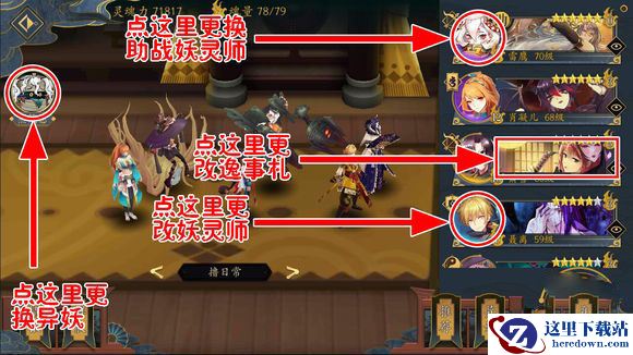 在这里点击右侧妖灵师头像可以上阵/更换妖灵师,点击逸事札可以上阵/更换逸事札