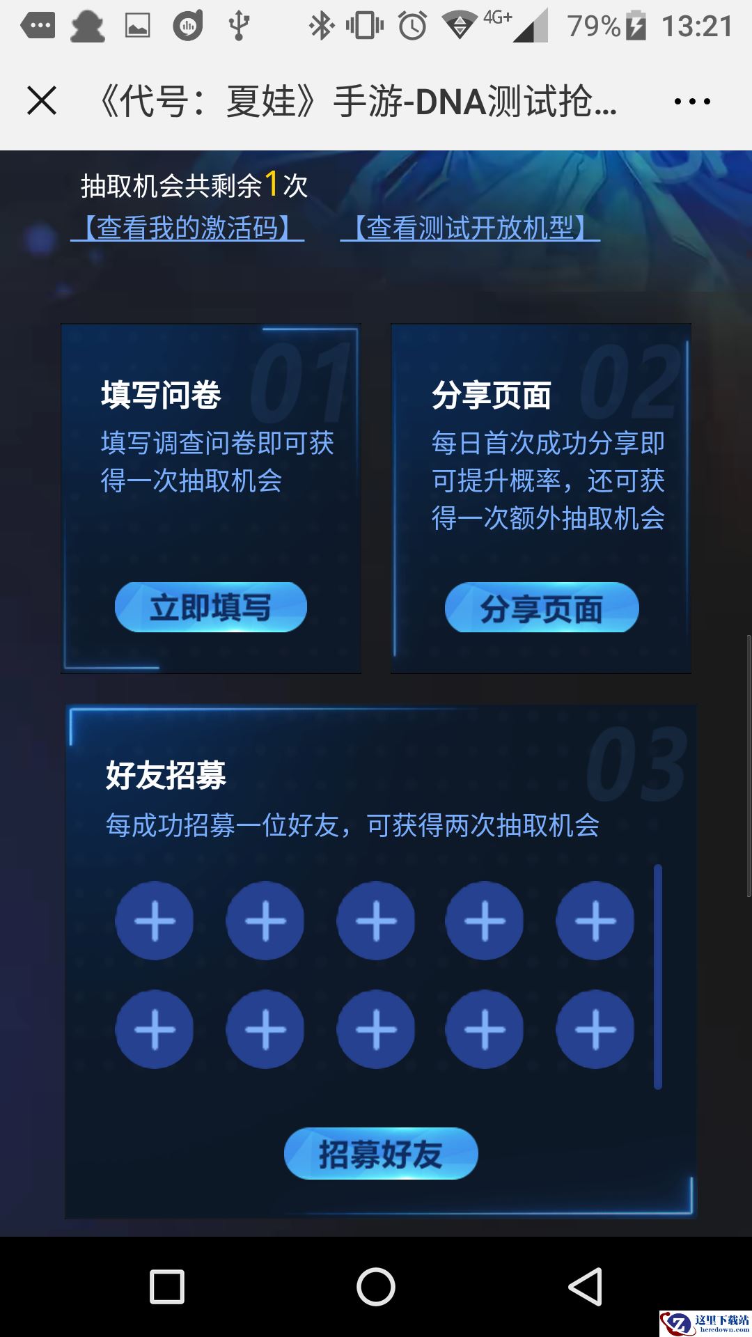 4、抢码方法如上图,通过填写问卷、分享页面、邀请好友来获取抽取次数,有几率获得邀请码