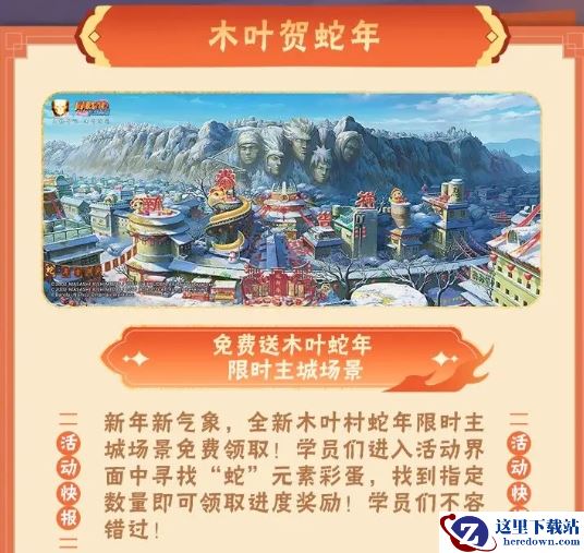 新年新气象,全新木叶村蛇年限时主城场景免费领取!学员们进入活动界面中寻找“蛇”元素彩蛋,找到指定数量即可领取进度奖励!学员们不容错过!