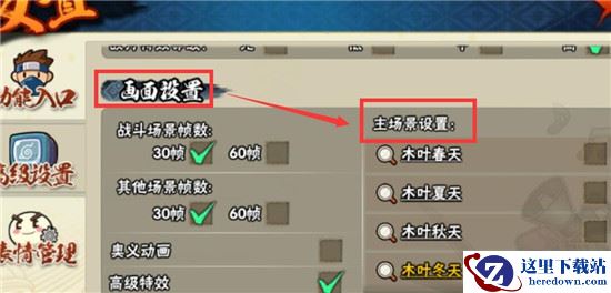 在“高级设置”中,玩家找到“画面设置”按钮,看见右边有主场景设置一栏,里面可以勾选很多项目。