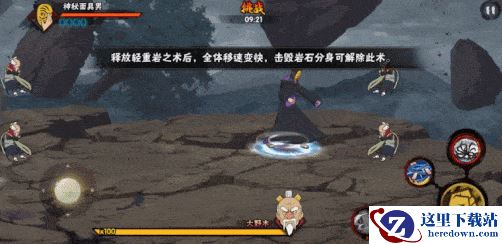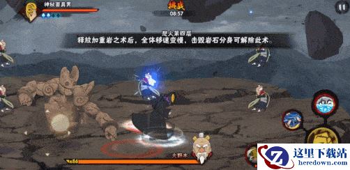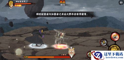 击败黄土就会与第三代土影大野木交手。此战分为三个阶段。开局大野木会分出四个岩石分身并使用轻重岩之术,全体移速会变快,需要击破全部分身才能解除。