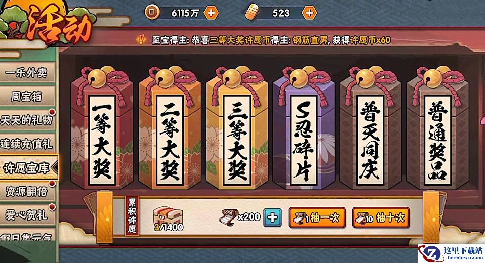 活动期间,学员花费金币购买幻彩石,可以获赠忍界召集券消耗忍界召集券进行许愿,每次必定获得许愿币*10和许愿奖品许愿币可以在许愿商店兑换S忍猿飞日斩[秽土转生]、长门[秽土转生]、佩恩[天道]、波风水门[秽土转生]、宇智波鼬[须佐能乎]和波风水门碎片等稀有物品。许愿奖品包括S忍碎片、精炼石等稀有道具,同时还有机会获得许愿大奖和普天同庆奖。抽中许愿大奖的学员可获得一定数量许愿币,抽中普天同庆奖的学员可获得大量铜币,且同服20级或以上学员都可以获得铜币奖励。活动期间的前3次许愿免费,许愿达到20、60、100、200次,可分别获得对应奖励,包括获得S忍碎片多选一礼包、勾玉和部分S级忍者奥义击杀图,礼包仅可领取一次。活动结束后,剩余的忍界召集券将会保留,许愿币会清空。