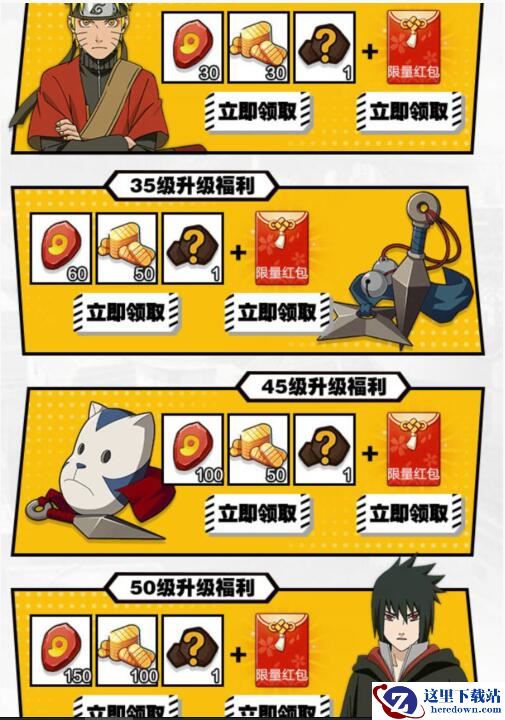 2.新玩家在活动期间内游戏角色分别达到25级、35级、45级、50级时,即可赢取对应礼包和红包奖励;