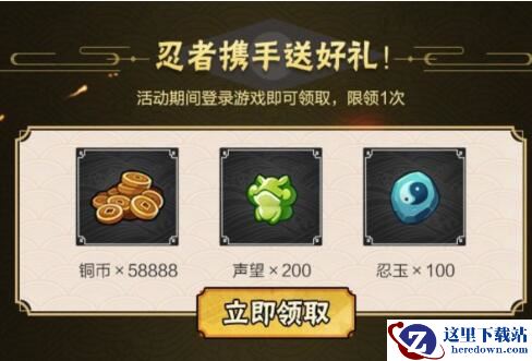 1、活动期间登录游戏即可领取忍者携手送好礼,限领1次。