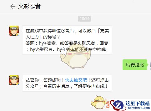 答题格式:hy+答案。如你的答案是火影忍者,则回复:hy火影忍者。各位忍者把正确答案告诉豚豚,就可以去领奖啦!