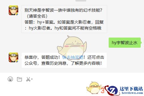 答题格式:hy+答案。如你的答案是火影忍者,则回复:hy火影忍者。各位忍者把正确答案告诉豚豚,就可以去领奖啦!