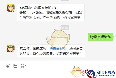 答题格式:hy+答案。如你的答案是火影忍者,则回复:hy火影忍者。各位忍者把正确答案告诉豚豚,就可以去领奖啦!