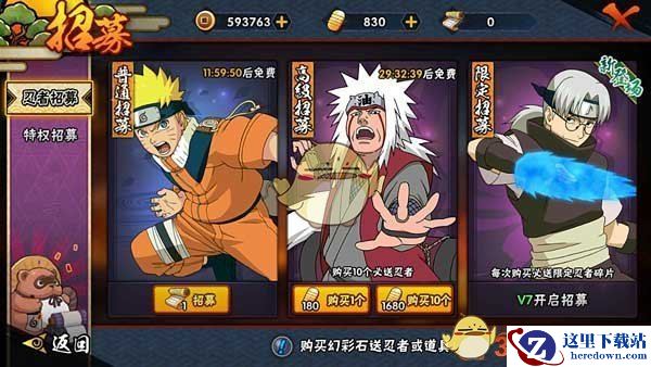 最后一个级别的招募需要特权V7才可以进行,每次招募必得限定忍者碎片,这也是获得限定忍者最有效最快速的方法。