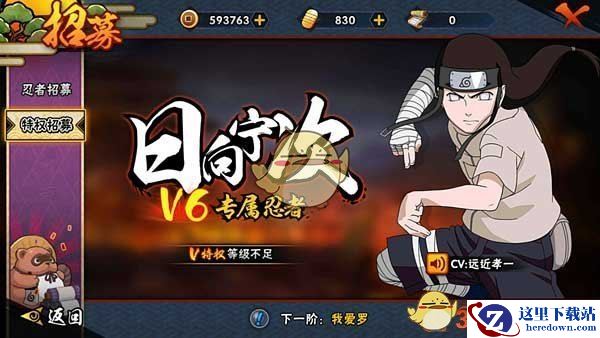 忍者招募第二个大选项是限定招募,点击进去我们可以看到日向宁次的大幅画面(那首宁次之死不知道让玩家们有多深沉的回味)。而日向宁次可以通过充值V6直接获得。注意,并不是宁次的忍者碎片,而是V6可以直接获得日向宁次这名忍者。