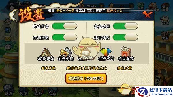 打开游戏,进入游戏的主界面。在主界面中我们看到最左侧的一列图标中(共四个图标),最上方的图标是一个齿轮形状的图标。这个图标就是《火影忍者》的设置,点击就可以进入到《火影忍者》的设置窗口。