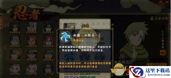 水遁·水柱击:利用前方带钩的棍棒勾住敌人,并抛掷到空中,然后使用水遁·水柱击进行攻击。