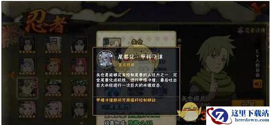 尾兽化·甲转飞沫:矢仓是能够完美控制尾兽的人柱力之一,完全尾兽化成矶怃,进行甲橹冲撞,最后吐出巨大水柱进行一次巨大的水遁攻击。