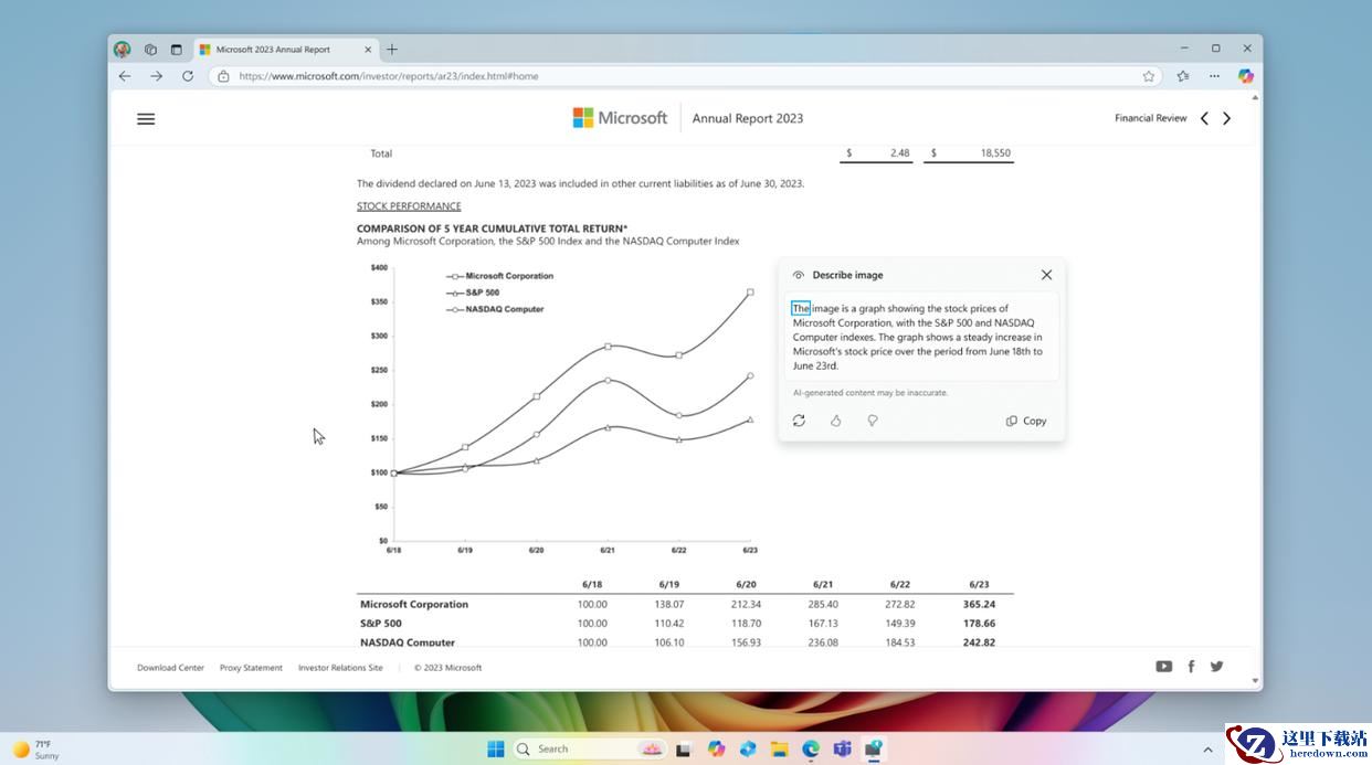 微软强化了图像描述功能(Narrator),现在 Copilot+ PC 支持读出各种图片的描述,帮助障碍人群了解图片中到底有什么东西。例如对于一张展示股票表现的图表,用户将得到如下详细描述“图表展示了微软公司的股票价格,同时包含 S&P 500 及 NASDAQ 电脑指数,该图表显示从 6 月 18 日至 6 月 23 日间微软股票价格的稳步上升”。