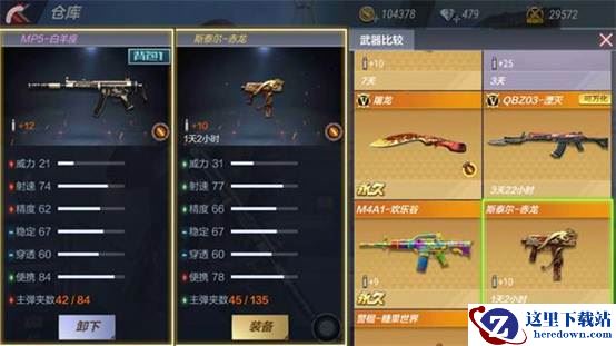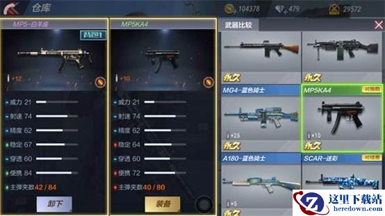 如图,MP5-白羊座和橙色品质的斯太尔-赤龙相比,前者在威力、射速、精度和主弹夹数上低于后者,便携高于后者,其他保持一致,即:前者在移速上稍占优势,后者于续航时间和输出伤害上占优,即:后者实战性能更佳。