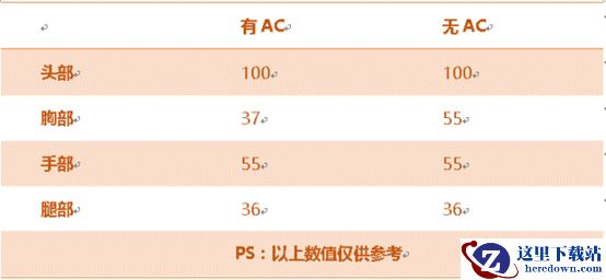 根据上述信息,我们可以看出:若目标配有AC,那么被沙鹰-双鱼座命中头部瞬秒、胸部和腿部3枪、手部2枪;反之,目标若未配置AC,那么头部、手部、腿部保持不变,胸部降至两枪(有无AC的最大区别)。