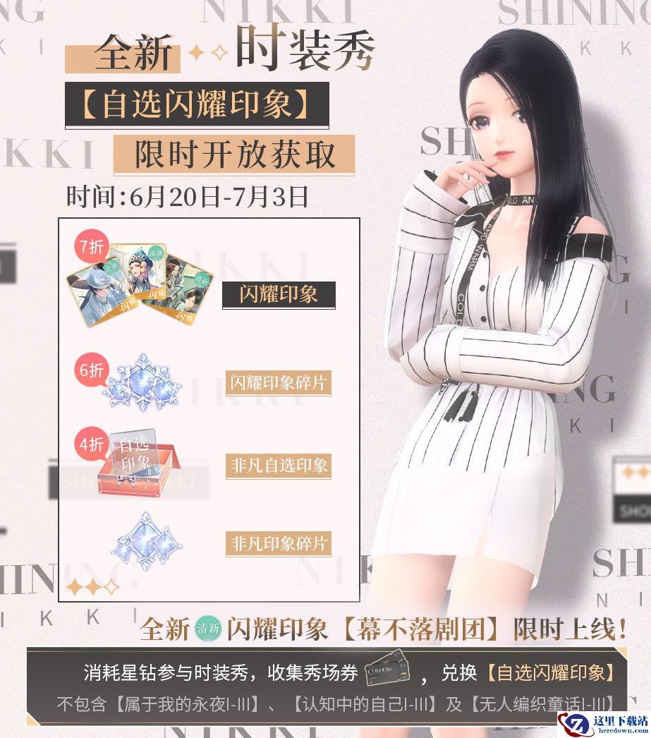 6月20日更新后,参加时装秀,收集秀场券,限时获取【自选闪耀印象】等奖励!