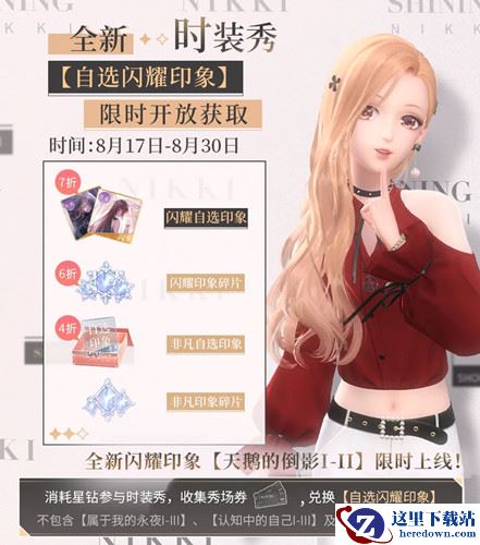 2、消耗指定数量的【秀场券】可在【秀场兑换处】换取7折【自选闪耀印象】、6折【闪耀印象碎片】、4折【自选非凡印象】、【非凡印象碎片】和冰凝之心等道具。