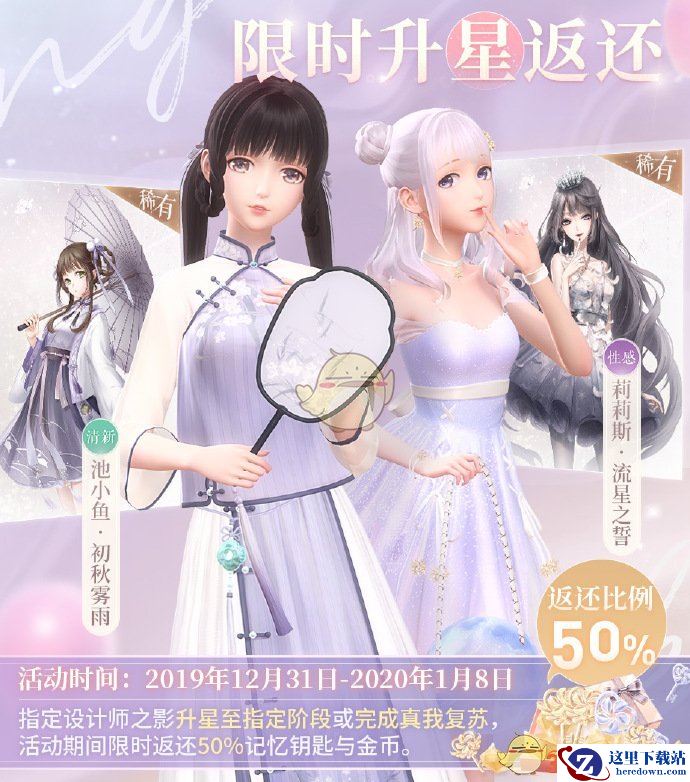 1、活动期间,指定套装的设计师之影星级提升至指定阶段,即可在活动界面领取对应阶段升星所消耗材料(记忆钥匙及金币)50%的返还奖励。