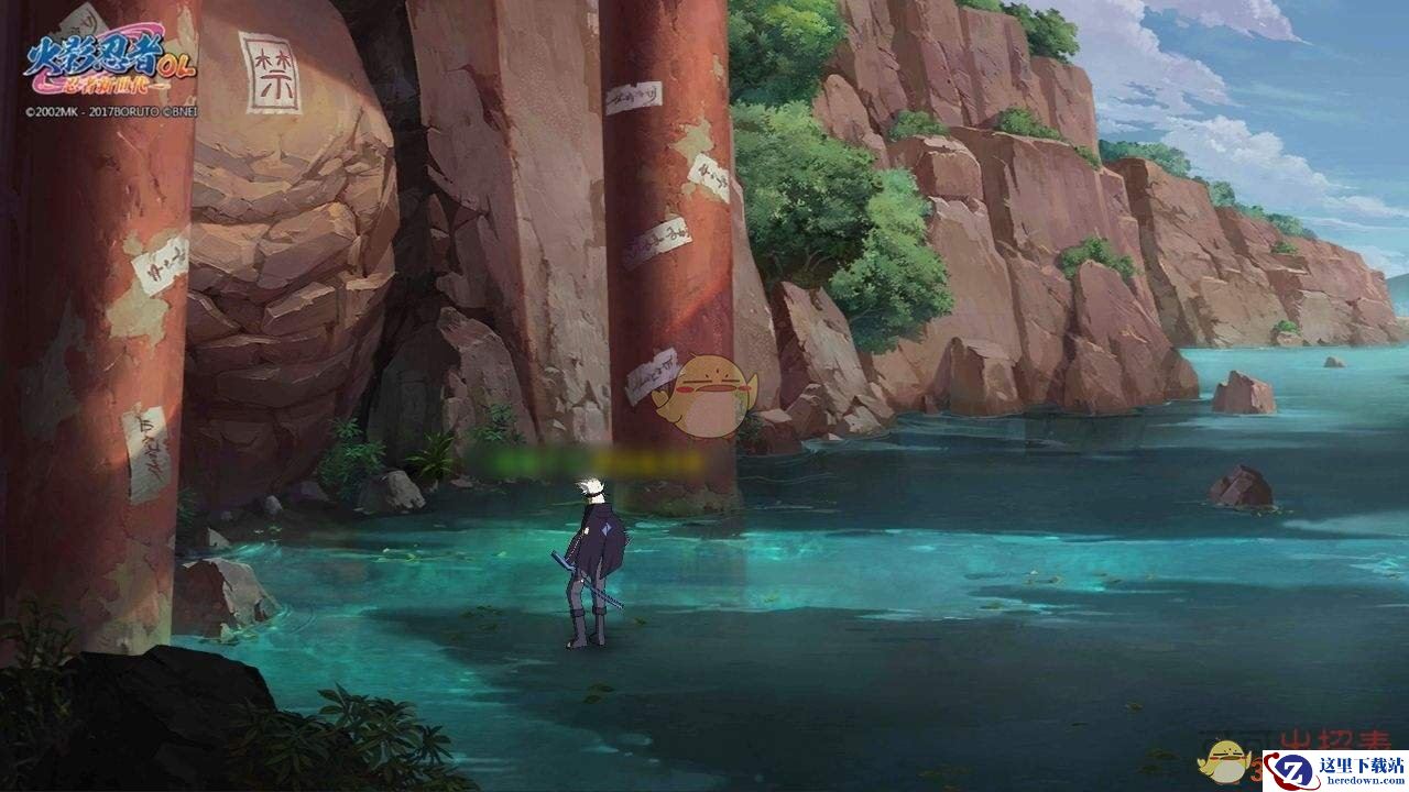 来到川之国峡谷,直接走到最上方的传送阵到达神秘的新场景!新场景较为狭窄,一块贴有“禁”字的巨石挡住了去路