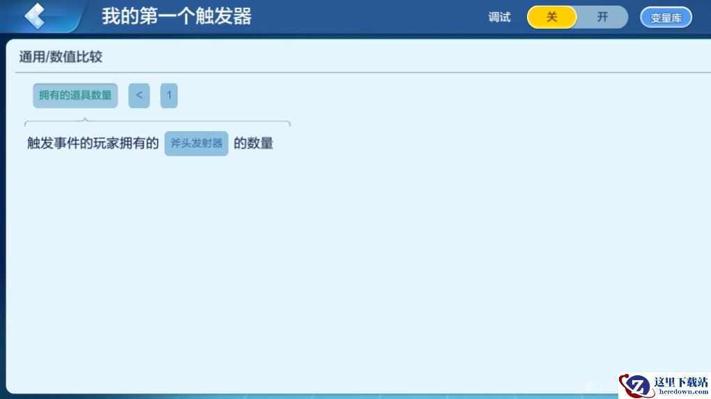 因此,我们需要设置一个限制,也就是,只有我们已有的“斧头发射器”数量为0时,才触发添加道具的动作