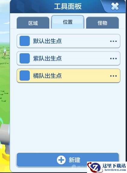 我们新建两个区域,分别以两个队伍命名【橘队】【紫队】,然后还需要两个出生点【橘队出生点】【紫队出生点】